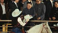 1979年2月2日晚间,在美国得克萨斯州休斯敦的骑术表演场,两位女骑士策马来到邓小平面前,把两顶骑士帽献给了他。邓小平接受了这一礼物,立即戴在头上,同大家一起鼓掌。